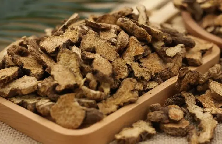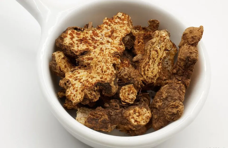 呈不规则连珠状或结节状圆柱形,略弯曲,偶有分枝,长3~10cm,直径1~2cm。表面灰棕色,有皱纹、横曲纹及残留须根,顶端具茎痕或残留茎基。质坚实,断面黄白色或灰白色,散有多数橙黄色或棕红色油室,暴露稍久,可析出白色细针状结晶。气香特异,味微甘、辛、苦。