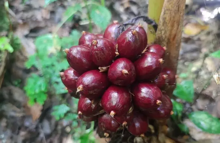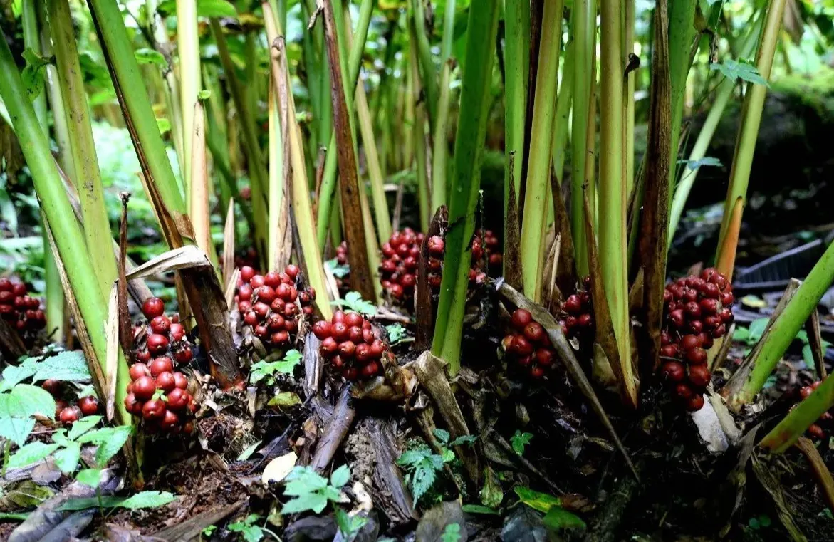 果实椭圆形,长2~4.5cm,直径1~2.5cm,表面棕色或红棕色,具3钝棱及明显的纵沟及棱线,先端有圆形突起的柱基,基部有果柄或果柄痕,果皮坚韧,内分3室,每室含种子7~24粒,种子集结成团。种子多面形,直径5~7mm,黄棕色或红棕色,具灰白色膜质假种皮,中央有凹陷合点,较狭端腹面有圆窝状种脐,种脊凹陷成1纵沟。气芳香,味辛、辣。