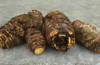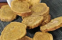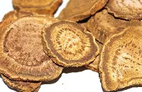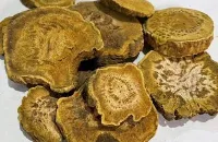 本品呈类圆柱形、圆锥形、纺锤形、卵圆形或一面平坦一面隆起的块片,长3-17cm,直径3-9cm。除尽外皮者,表面黄棕色至红棕色,可见类白色网状纹理,系由微细的类白色薄壁组织与棕红色射线交错而成,有时可见散在的星点(异型维管束),未除尽外皮者表面棕褐色,有横皱纹及纵沟,顶端有茎叶残基。切面多凹凸不平。质坚实,有的中心稍松软,不易折断,折断面淡红棕色或黄棕色,颗粒性;根茎髓部宽,有星点环列或散在;根木质部发达,具放射状纹理,形成层环不明显,无星点。气清香,味苦、微涩。嚼之粘牙,有沙粒慼。均以外表黄棕色、锦纹及星点明显、体重、质坚实、有油性、气清香、味苦而微涩、嚼之粘牙者为佳。