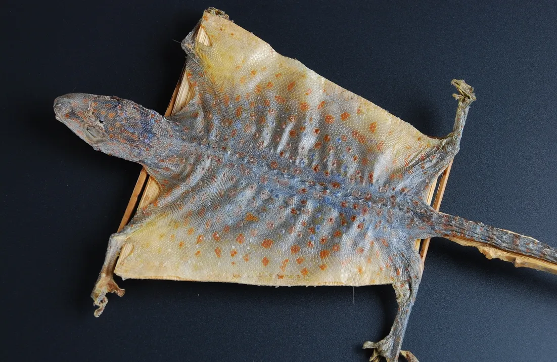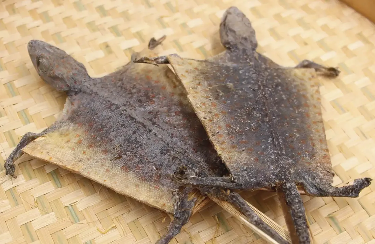 壁虎科动物蛤蚧Gekko gecko Linnaegus的干燥体。全年均可捕捉,除去内脏,拭净,用竹片撑开,使全体扁平顺直,低温干燥。