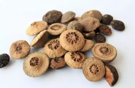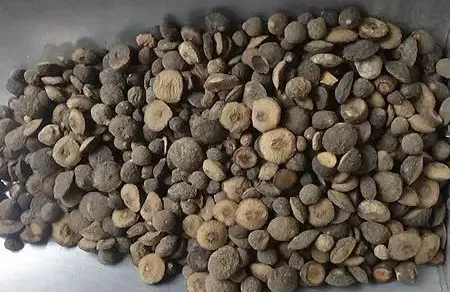 该品呈半球形,少数为球形,直径0.5~2.5cm。外果皮黑绿色或暗棕绿色,具颗粒状突起和皱纹,有明显的花柱残迹或果梗痕。切面中果皮略隆起,黄白色或黄褐色,厚0.3~1.2cm,边缘有1~2列油室,瓤囊棕褐色。质坚硬。气清香,味苦、微酸。