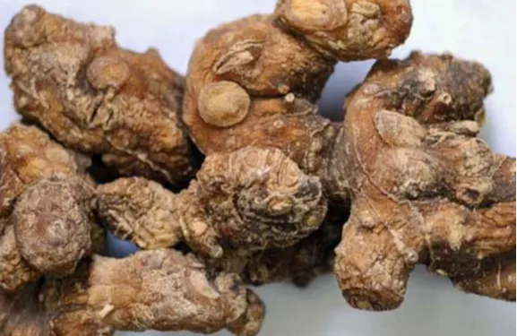 黄精根茎结节状。一端粗,类圆盘状,一端渐细,圆柱状,全形略似鸡头,长2.5~11cm,粗端直径1~2cm,常有短分枝,上面茎痕明显,圆形,微凹,直径2~3mm,周围隐约可见环节;细端长2.5~4cm,直径5~10mm,环节明显,节间距离5~15mm,有较多须根或须根痕,直径约1mm。表面黄棕色,有的半透明,具皱纹;圆柱形处有纵行纹理。质硬脆或稍柔韧,易折断。断面黄白色,颗粒状,有黄棕色给管束小点。气微,味微甜。姜形黄精多为长条结块状,长短不等,常数个块状结节相连。