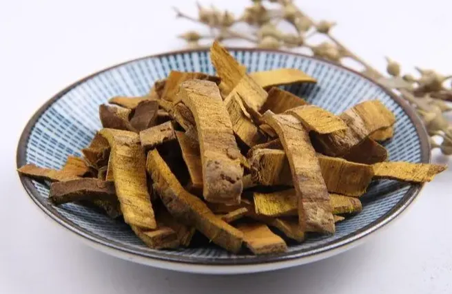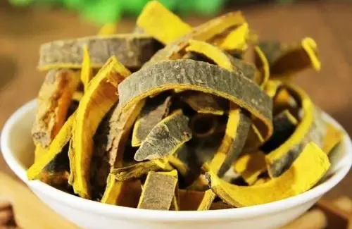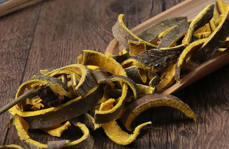 呈板片状或浅槽状,长宽不一,厚3~6mm。外表面黄褐色或黄棕色,平坦或具纵沟纹,有的可见皮孔痕及残存的灰褐色粗皮。内表面暗黄色或淡棕色,具细密的纵棱纹。体轻,质硬,断面纤维性,呈裂片状分层,深黄色。气微,味甚苦,嚼之有粘性。