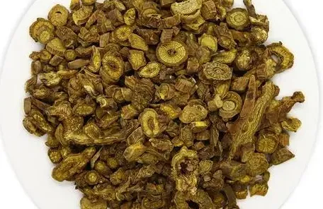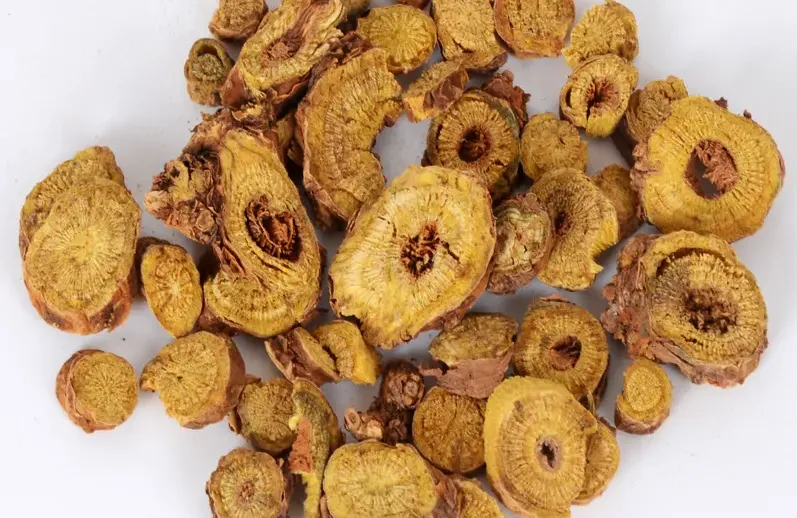 该品呈圆锥形,扭曲,长8~25cm,直径1~3cm。表面棕黄色或深黄色,有稀疏的疣状细根痕,上部较粗糙,有扭曲的纵皱或不规则的网纹,下部有顺纹和细皱。质硬而脆,易折断,断面黄色,中间红棕色,通称子芩,以清火养阴为主;老根中间呈暗棕色或棕黑色,枯朽状或已成空洞,称枯芩,以清火败毒为主。气微,味苦。
