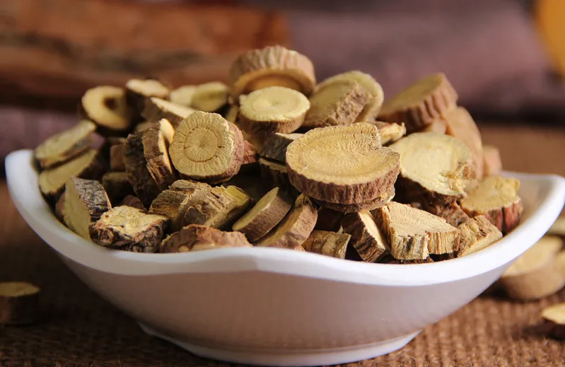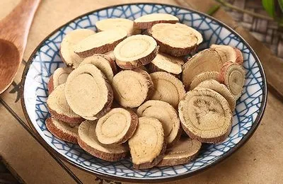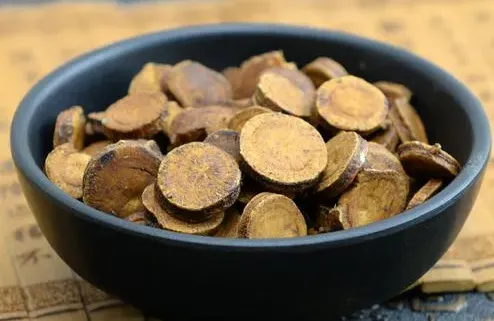 采集加工 春,秋二季采挖,除去须根,晒干。 炮制方法 1、甘草:除去杂质,洗净,润透,切厚片,干燥。 2、炙甘草:取甘草片,照蜜炙法炒至黄色至深黄色,不粘手时取出,晾凉。本品呈类圆形或椭圆形切片。外表皮红棕色或灰棕色,微有光泽。切面黄色至深黄色,形成层环明显,射线放射状。略有黏性。具焦香气,味甜。