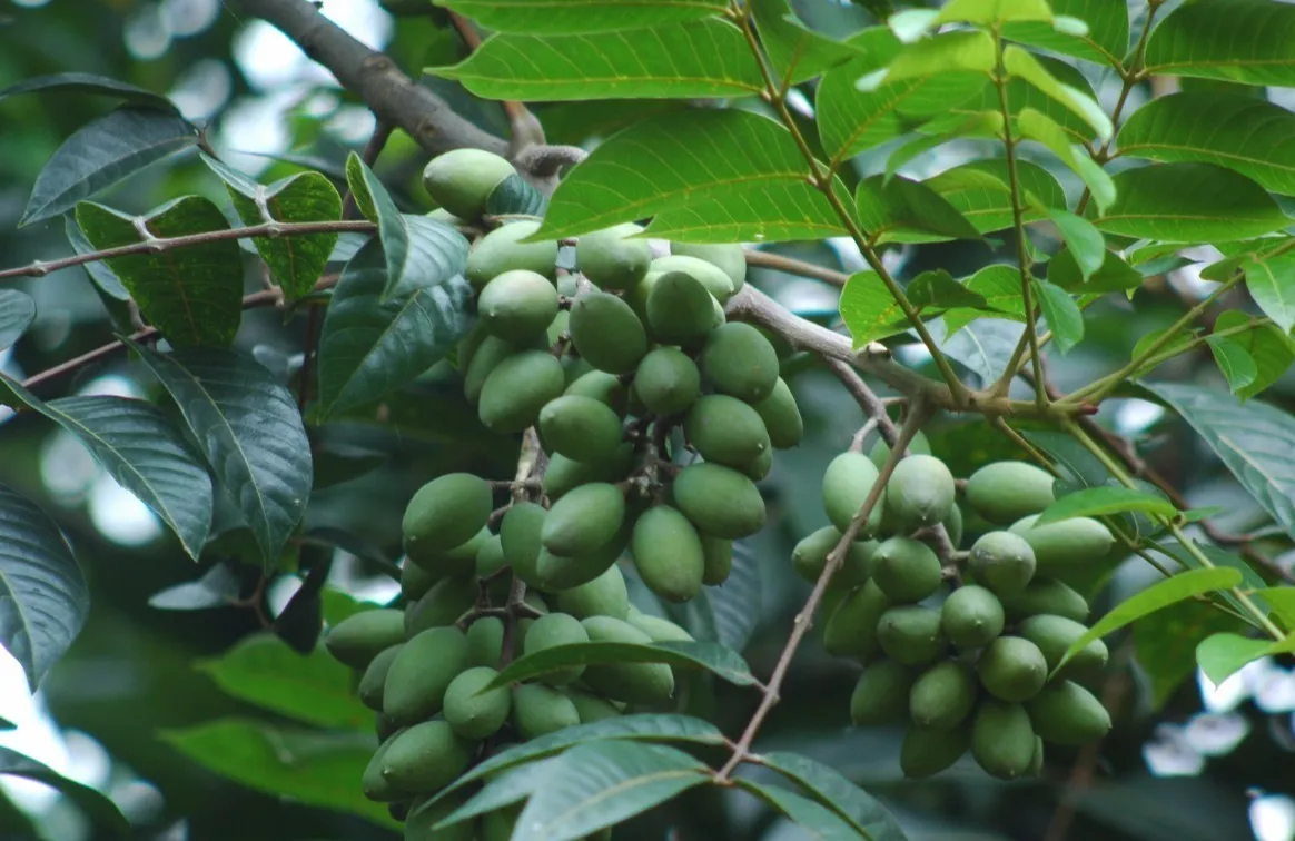 鲜青果,呈梭状,两端钝圆,或渐尖,长可达3~4cm,粗约1.5~2cm。外表碧绿或黄绿色。时日较久者呈乌黄色、平滑、微带光泽。顶端有细小黑色的突起。基部有果柄痕迹。果肉颇厚实,内面黄白而多汁液。果核呈梭形,棕褐色,具6条梭线;质坚硬不易碎。核的横切面可见3个孔洞,其中各有一粒细长梭形的种子;种皮红棕色,种仁白色,油润,有香气、无臭,味涩微酸,嚼之有回甜。干青果;外形同上,外表棕褐色或紫棕色,皱缩,有多数凹凸不平的皱纹。果肉较薄,棕褐色或灰色,质坚韧,可与果核分离,内核性状与鲜者无异。味甜,酸涩味较差。