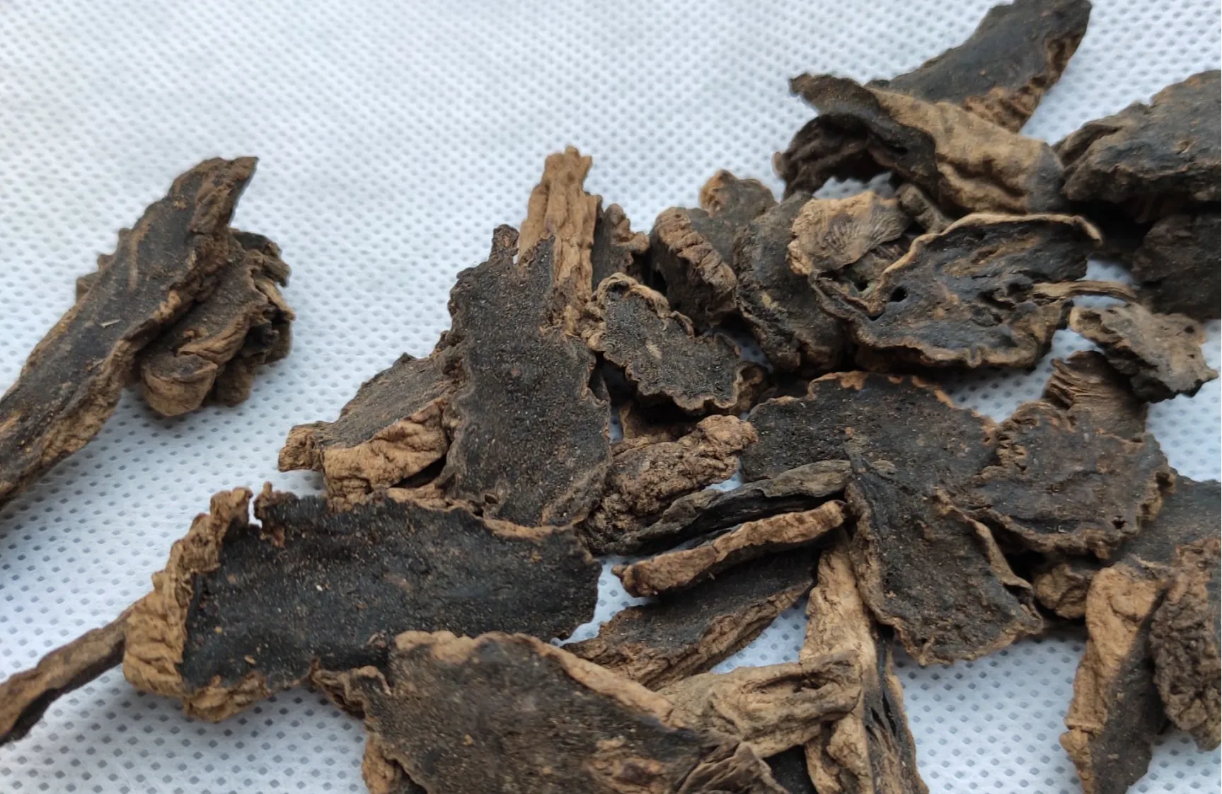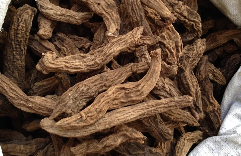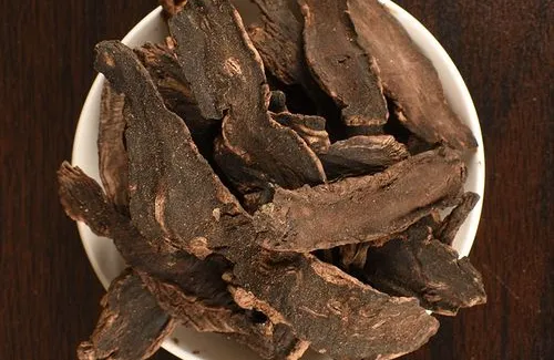 根类圆柱形,中间略粗或上粗下细,有的微弯曲,长6~20cm,直径1~3cm。表面灰黄色或灰褐色,有不规则的纵沟、横向皮孔及稀疏的横裂纹和须根痕。质坚实,不易折断,断面黑色,微有光泽。气特异似焦糖,味甘、微苦、咸。