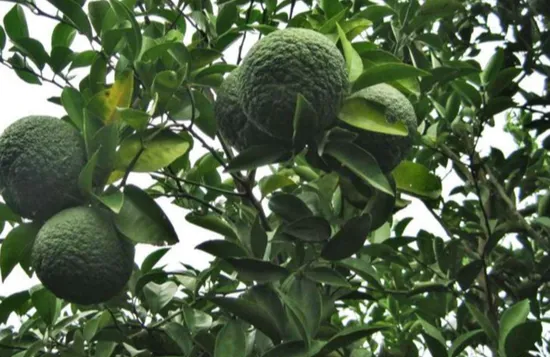 果实呈半球形,直径3~5.5cm。外皮绿褐色或棕褐色,略粗糙,散有众多小油点,中央有明显的花柱基痕或圆形果柄痕。切面中果皮厚0.6~1.2cm,黄白色较光滑,略向外翻,有维管束散布,边缘有棕黄色油点l~2列。质坚硬,不易折断,瓤囊7~12瓣,少数至15瓣,囊内汁胞干缩,棕黄色或暗棕色,质软,内藏种子。中轴坚实,宽5~9mm,黄白色,有一圈断续环列的维管束点。气香,味苦、微酸。