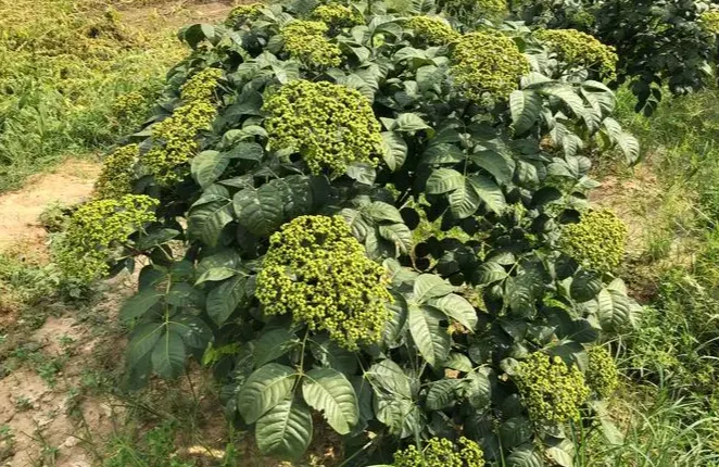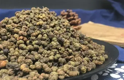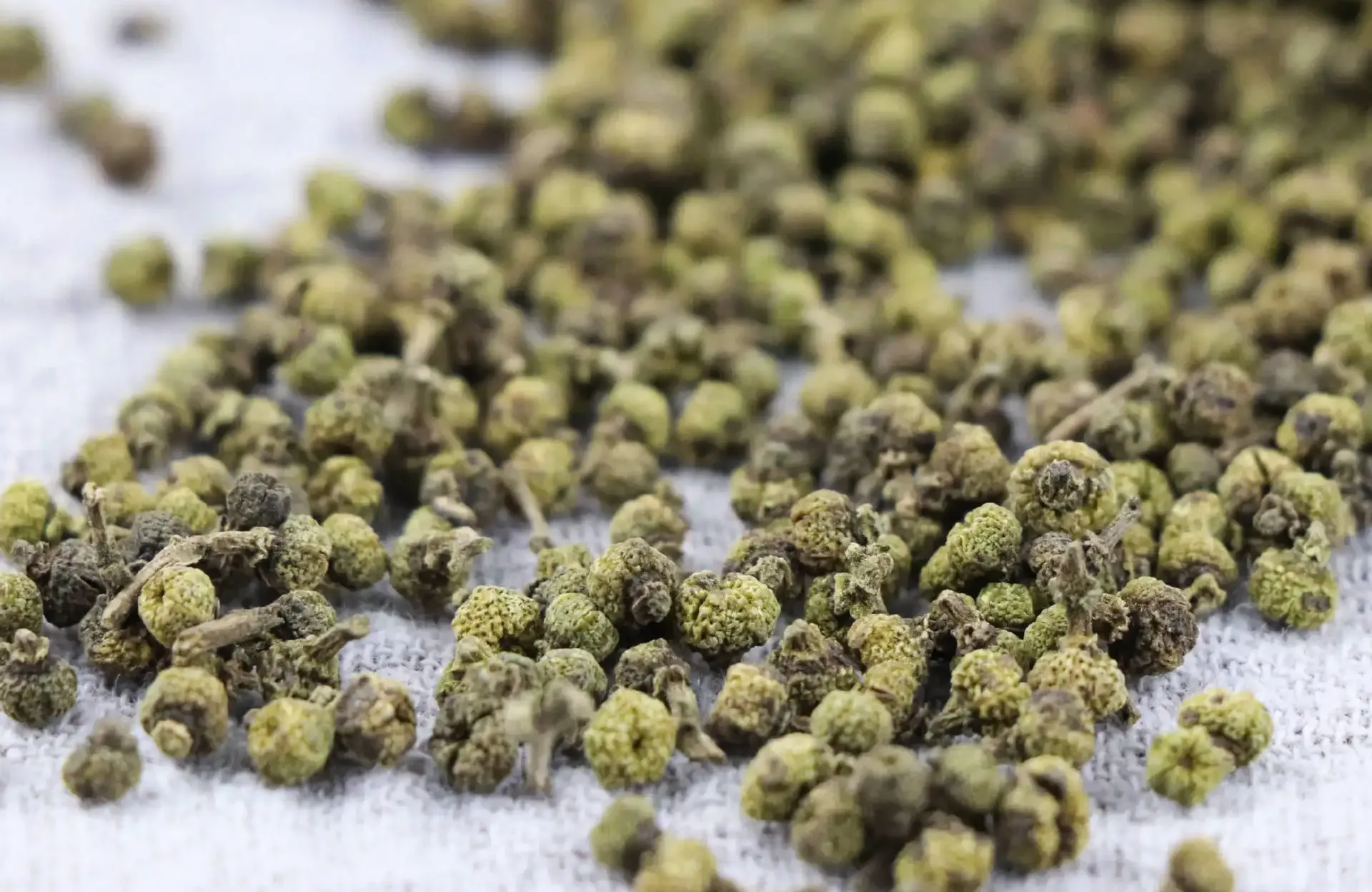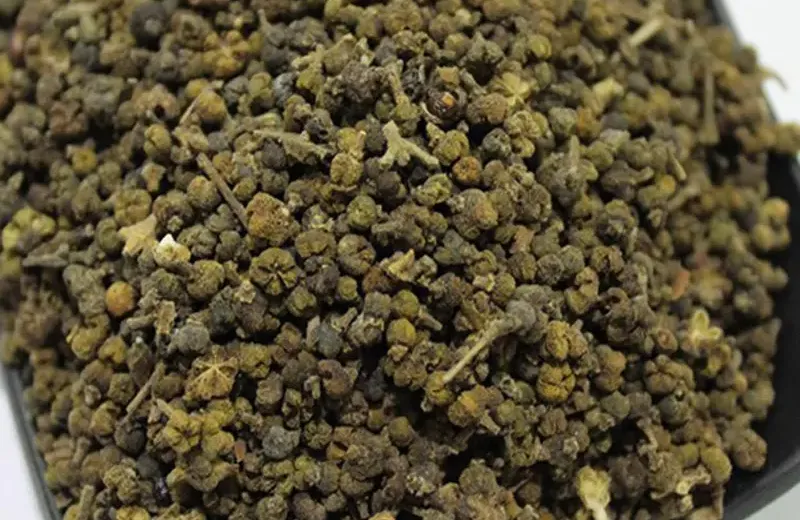 果实呈五角状扁球形,直径2~5mm。表面暗黄绿色至褐色,粗糙,有点状突起或凹下的油点。顶端有五角星状的裂隙,基部残留被有黄色茸毛的果梗。质硬而脆。气芳香浓郁,味辛辣而苦。