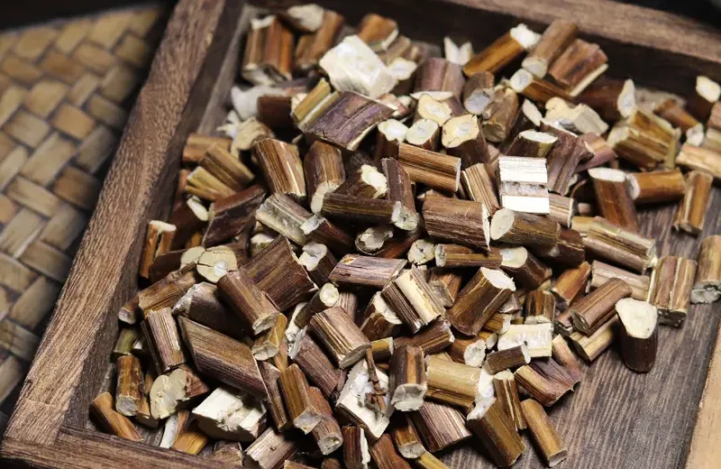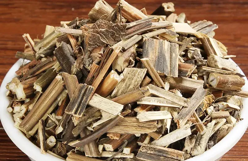 本品呈方柱形,四棱钝圆,长短不一,直径0.5~1.5cm。表面紫棕色或暗紫色,四面有纵沟及细纵纹,节部稍膨大,有对生的枝痕和叶痕。体轻,质硬,断面裂片状。切片厚2~5mm,常呈斜长方形,木部黄白色,射线细密,呈放射状,髓部白色,疏松或脱落。气微香,味淡。
