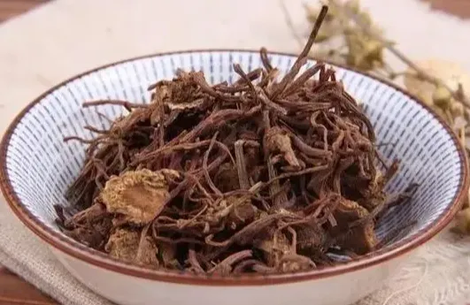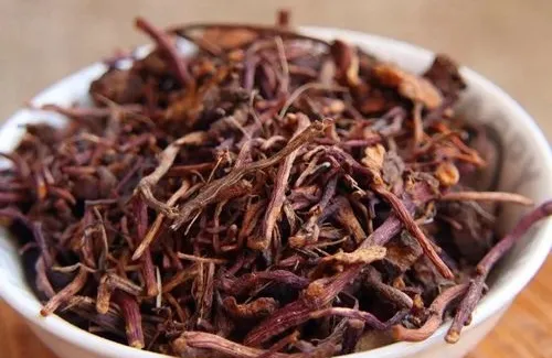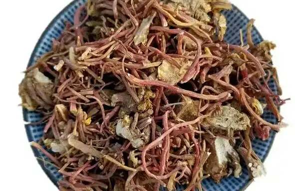 根茎不规则块状,大小不一,顶端有茎、叶的残基,下端偶有末除尽的母根,质梢硬。根茎簇生多数细根,长3~15cm,直径0.1~0.3cm,多编成辫状;表面紫红色或灰红色,有纵皱纹;质较柔韧。气微香,味甜、微苦。