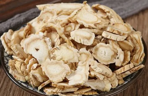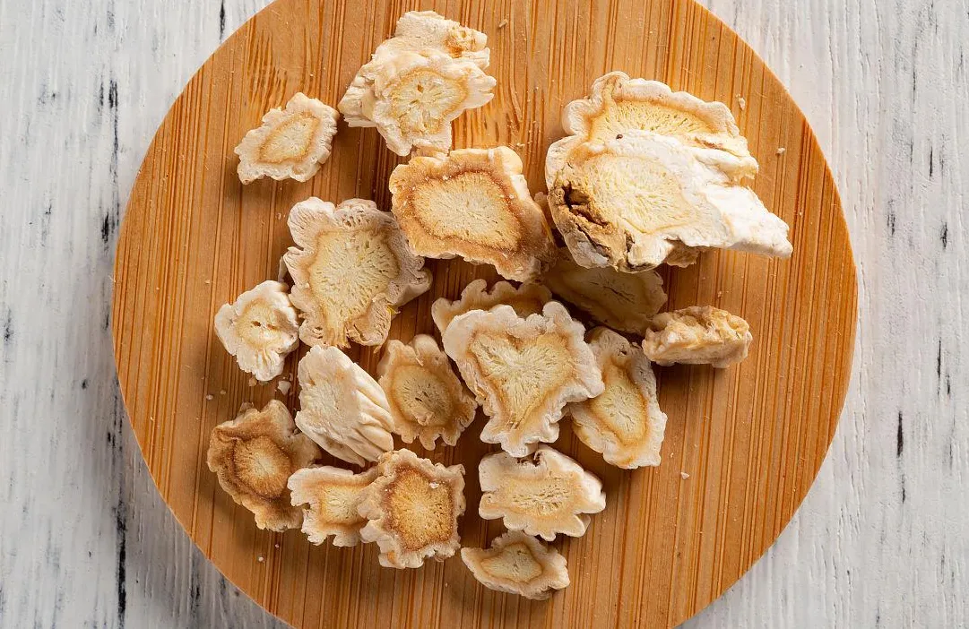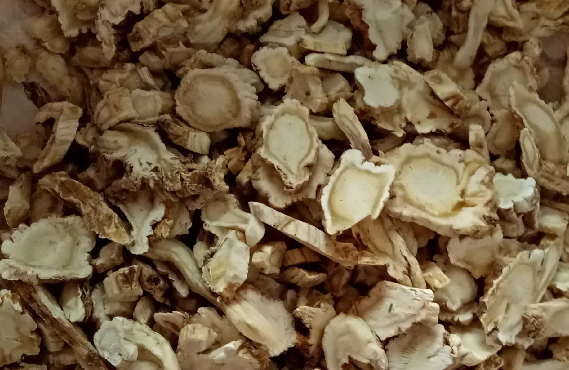 根长圆形或长纺锤形,稍扭曲,下部偶有分支,长6~20cm,直径1~2cm。表面淡黄白色或淡黄棕色 (未去栓皮者),皱缩,有扭转的纵沟及横长的皮孔斑痕,上部有横纹;顶端芦头 (根茎) 长0.5~4cm,有半月形凹陷的茎痕,呈盘节状。质坚实,横断面淡黄色,角质样,形成层环棕色,皮部有稀少放射状裂隙,木部较紧密。气微,味微甜后苦。饮片性状:桔梗为不规则圆形厚片,表面白色或淡黄白色,有一浅棕色环,周边呈淡黄白色,有皱纹。无臭,味微甜后苦。蜜桔梗,形如桔梗生片,表面淡黄色至淡棕黄色,滋润,微具蜜糖香气。味甜而后苦。
