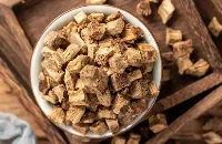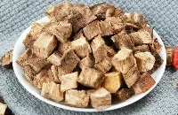 本品呈纵切的长方形厚片或小方块,长5~35cm,厚0.5~1cm。外皮淡棕色,有纵皱纹,粗糙。切面黄白色,纹理不明显。质韧,纤维性强。气微,味微甜。