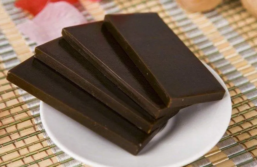 本品呈整齐的长方形或方形块。通常长约8.5cm,宽约3.7cm,厚约0.7cm或1.5cm。表面棕褐色或黑褐色,有光泽。质硬而脆,断面光亮,碎片对光照视呈棕色半透明。气微,味微甘。正品阿胶为长方形或方形块,质硬而脆,无油孔、气孔及明显刀纹。表面平滑有光泽,断面对光照视呈棕色半透明状,胶块表面当以黄透如琥珀色,光黑如漆。