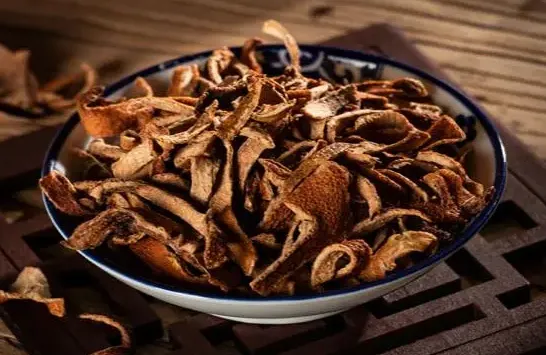 常剥成数瓣,基部相连,有的呈不规则的片状,厚1~4mm。外表面橙红色或红棕色,有细皱纹及凹下的点状油室;内表面浅黄白色,粗糙,附黄白色或黄棕色筋络状维管束。质稍硬而脆。气香,味辛、苦。 陈皮:常剥成数瓣,基部相连,有的呈不规则的片状,厚1~4mm。外表面橙红色或红棕色,有细皱纹及凹下的点状油室;内表面浅黄白色,粗糙,附黄白色或黄棕色筋络状维管束。质稍硬而脆。气香,味辛、苦。 广陈皮:常3瓣相连,形状整齐,厚度均匀,约1mm。点状油室较大,对光照视,透明清晰。质较柔软。