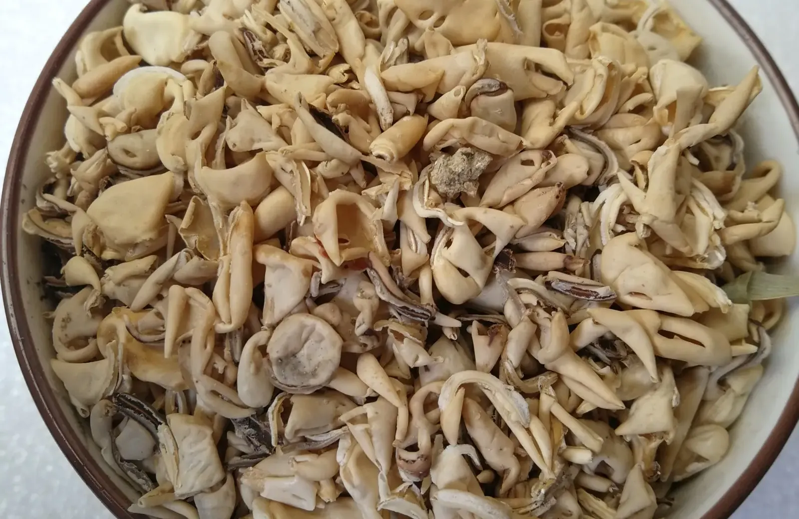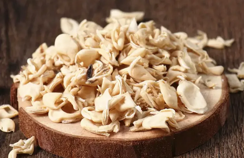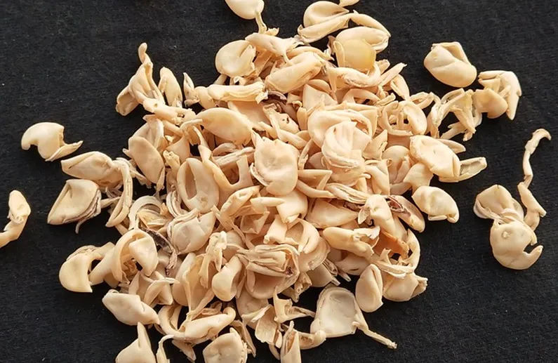 本品呈囊壳状、凹陷或卷缩成不规则瓢片状,长约 1 cm,厚不超过 1 mm,表面光滑,乳白色或淡黄白色,有的可见种阜,完整的种阜半月形,类白色。质硬韧,体轻。气微,味淡。以囊壳完整、色黄白、不带种仁者为佳。