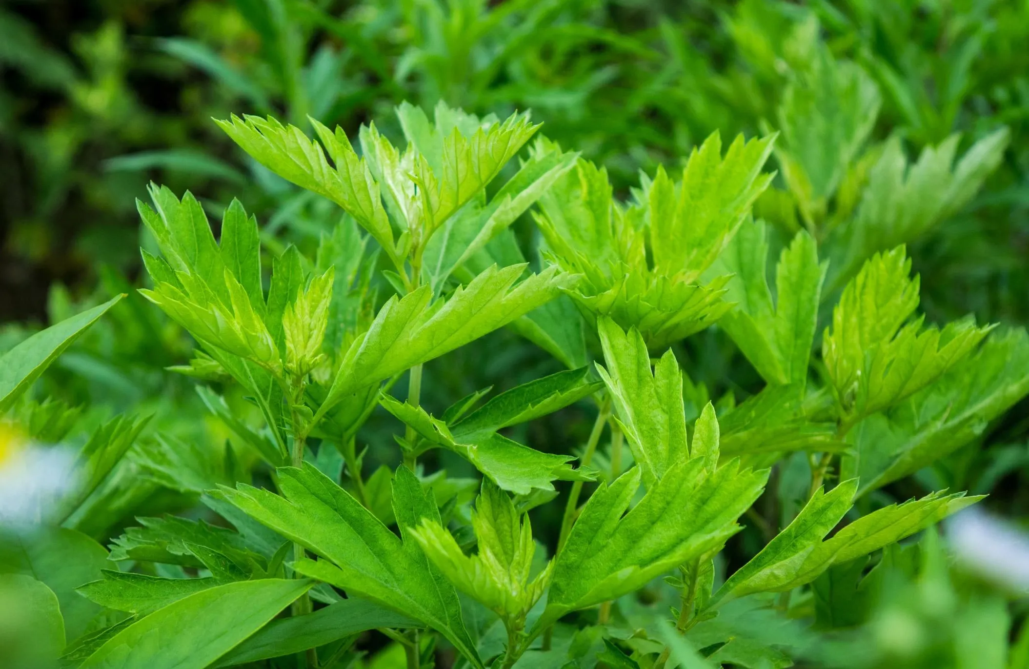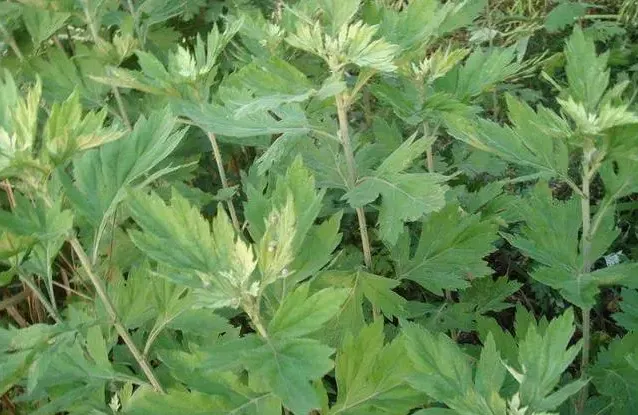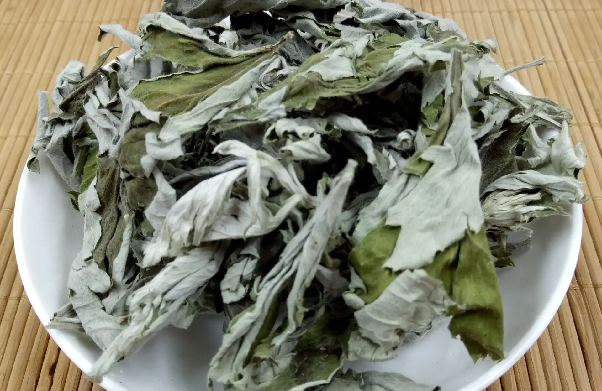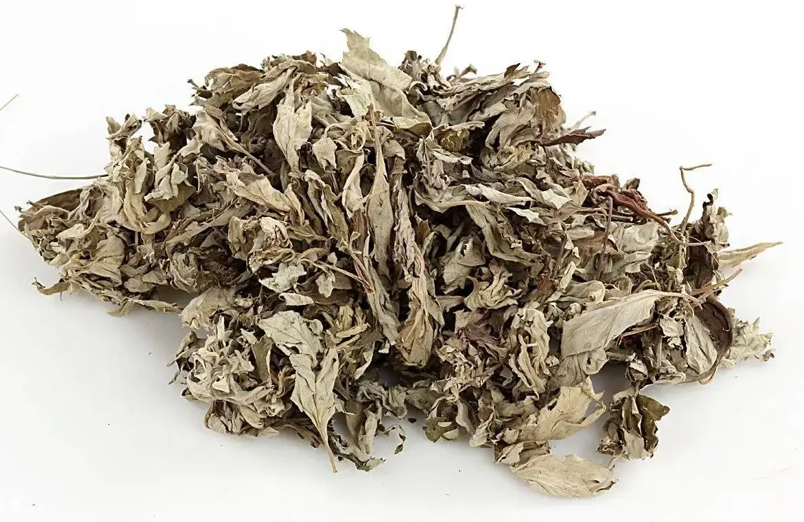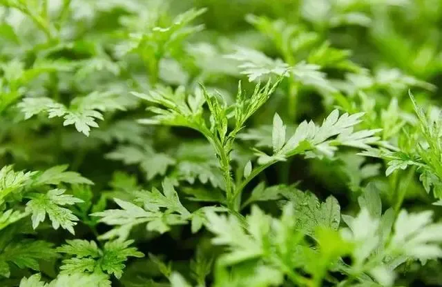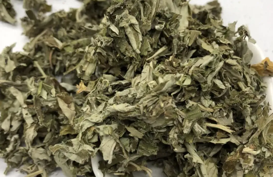 本品多皱缩、破碎,有短柄。完整叶片展平后呈卵状椭圆形,羽状深裂,裂片椭圆状披针形,边缘有不规则的粗锯齿;上表面灰绿色或深黄绿色,有稀疏的柔毛和腺点;下表面密生灰白色绒毛。质柔软。气清香,味苦。